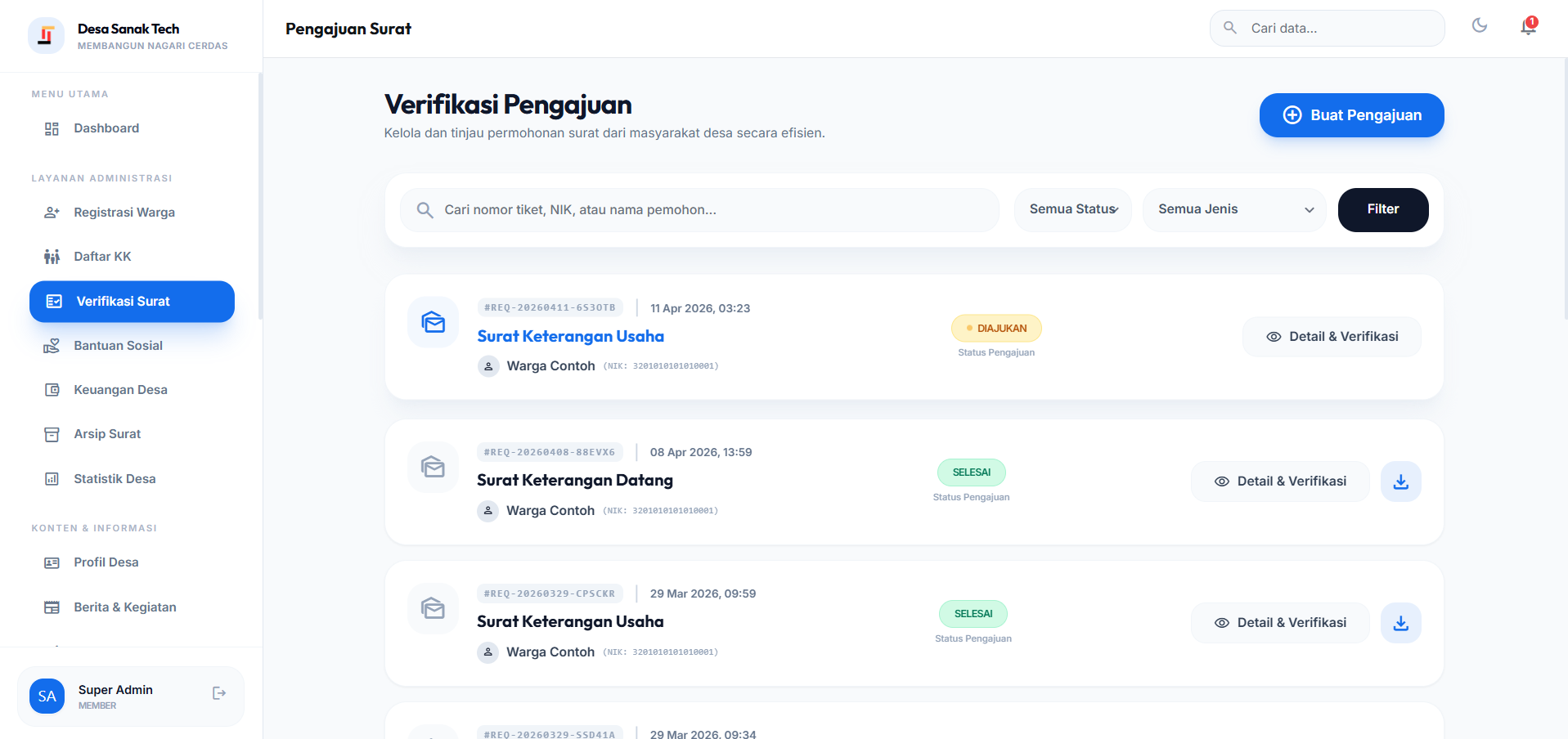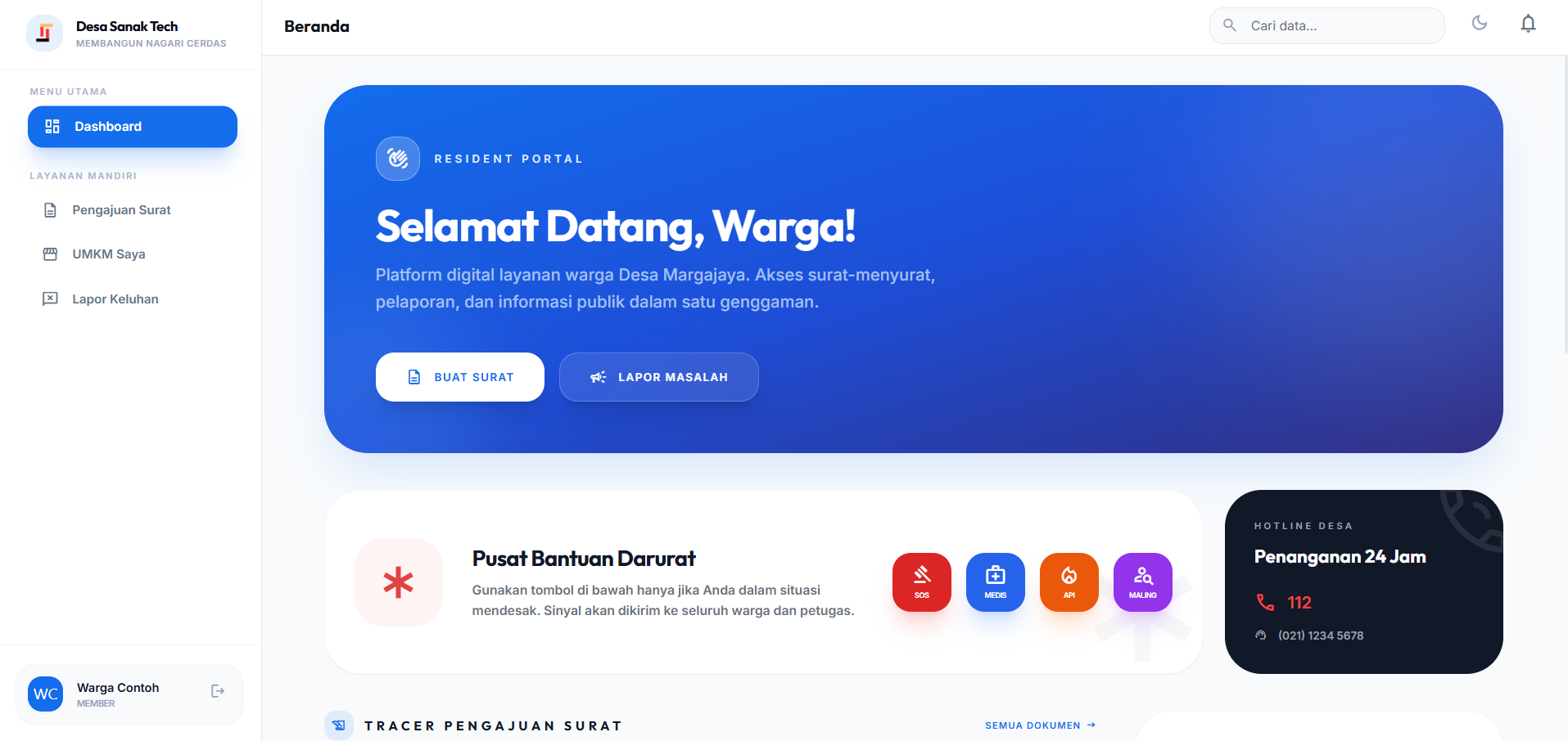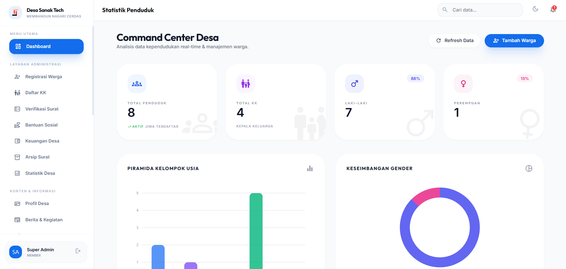 Platform manajemen pemerintahan desa berbasis web dan android, lengkap dengan command center kependudukan, administrasi surat, keuangan, dan layanan warga — semua dalam satu sistem terintegrasi.
